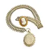 An egg shaped gem set archaeological revival style pendant stamped "Italy 750" tests as 18ct gold. Gross weight 11.2 grams approximately. Along with a 9ct yellow gold fancy link chain approximate le