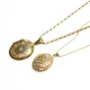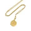 A 9ct gold circular locket, with tri colour engraved foliate decoration, diameter approx 38mm, suspended from a 9ct gold trace link chain, length approx 70cm, combined total gross weight approx 23gms