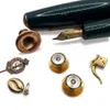 A pair of diamond and mother of pearl set dress studs in precious yellow metal, together with another 9ct gold dress stud, a 14k nib Parker fountain pen and other items. The diamond set studs surface …