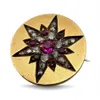 A ruby and diamond star set dress button converted into a brooch. Engraved "Souvenir Xmas 1910" to the verso, with a barrel hinge and C clasp. Surface testing as 14ct gold. Approximate diameter 17mm. …