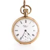 A gold plated open faced pocket watch, comprising a white dial with numeral markers, subsidiary dial at 6, case approx 50mm, keyless wind, inscribed to inner cover, along with a 9ct gold graduated Alb…