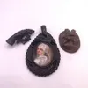 A small collection of Victorian imitation jet jewellery. Comprising a press dyed horn pendant with a hand painted panel portrait of a peasant woman (in as found condition due to a break across the hor…