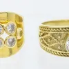 A 15ct gold single stone ring, set with a colourless round mixed cut stone, overlaid to gold Etruscan decoration, width approx 11mm, size P, total gross weight approx 7gms, along with a colourless fou…