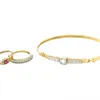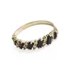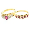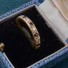 An antique style half hoop ring in 9ct gold. Set with three synthetic rubies interspersed with paste brilliants. Hallmarked London 1973, size M. Gross weight approximately 4.47gm
