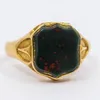 A 19th century bloodstone and 18ct gold poison ring, comprising a bloodstone set shield shaped cartouche, width approx 13mm, hinged and opening to reveal plaited hair within a glazed compartment, fanc…