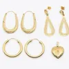 A collection of 9ct gold earrings, to include hollow hoop and creole examples, along with a pair of pierced drops, length approx 40mm and a 9ct gold heart shaped locket set with a small diamond, combi…