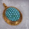 A Victorian Etruscan turquoise set gold mourning pendant, circular domed form, set to the centre with a cluster of round turquoise, raised above a gold border set with oval turquoise and overlaid rope…