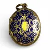 A Victorian blue enamel locket in precious yellow metal. With blue enamelled patterned decoration to the front and engraved pattern to the verso. With two glazed panels within. In unmarked yellow meta…