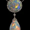 An early 20th century diamond and opal necklace, comprising of a large black oval opal cabochon measuring approximately 22 x 20mm suspended from an integral white metal chain, bordered by partially mi…