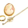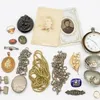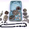 A collection of antique and vintage jewellery and components. To include two Victorian Jet cameo drops; a similar larger drop in Vulcanite; a Victorian white metal and malachite lovers knot brooch; a