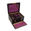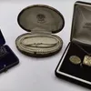 A Victorian plush and satin line jewellery case, with a small parcel of antique jewellery. To include a "9ct" stamped bar brooch, a gilded sterling silver horseshoe brooch; a mother of pearl set Ypre
