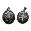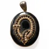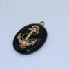 A Victorian onyx and seed pearl mourning locket, with vacant locket. Measures approximately 45 x 30mm with unmarked yellow metal fittings ( at fault due to small chip below bale, pearls in good condi