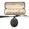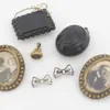 Selection of Jet, Glass and Plastic Jewellery. To include; a Jet Brooch with a picture of some building ruins, a Jet Pendant with flower decoration with a matching brooch, a beaded Jet necklace that