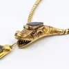 A Victorian gold and garnet set serpent necklace, comprising a graduated fancy link chain, with a serpents head to the front, set with a mixed pear cut garnet to the head, round cabochon garnet set ey…