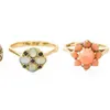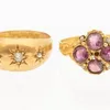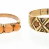 Two early 20th century coral set 9ct rose gold rings, including a graduated five stone ring, set with round cabochon stones, width approx 4mm, size L, along with a pearl and coral set wide band with s…