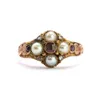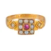 A VICTORIAN 15CT GOLD RUBY AND HALF PEARL SQUARE CLUSTER RING — Mounted with the square cut ruby at the centre within a surround of eight half pearls, between half pearl shoulders, Birmingham 1878, ri…