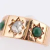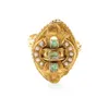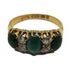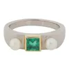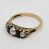 A 9ct. gold, pearl and green paste ring, set three graduated pearls alternating with two pairs of round cabochon paste, size UK M 1/2. (gross weight 2.1g)