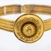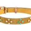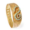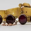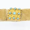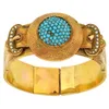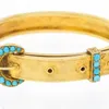 An Victorian turquoise set gold buckle hinged bangle, the buckle set with small graduated turquoise, width approx 18mm, internal diameter approx 55mm, with safety chain, unmarked assessed as 15ct gold…