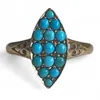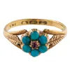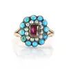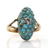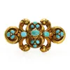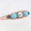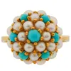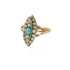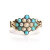 A Victorian "15ct" stamped turquoise and seed pearl dress ring. Featuring a central split pearl, framed by nine turquoise cabochons. With carved shoulders. Stamped "15ct" and surface testing according…