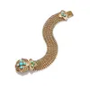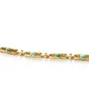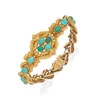 An 18ct. gold, diamond and turquoise bracelet, fashioned from flower form links with textured petals, each set either single round brilliant cut diamond or circular cabochon turquoise, length 17.5cm. …