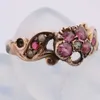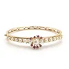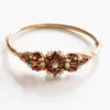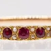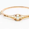An Edwardian opal and ruby set 9ct rose gold hinged bangle, comprising an open work quatrefoil motif set to the centre with a round opal cabochon, with small round mixed cut rubies set to each quatref…
