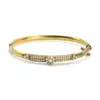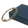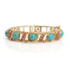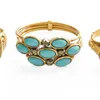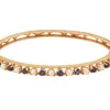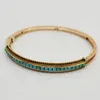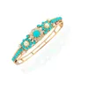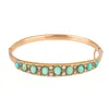 A GOLD, TURQUOISE AND ROSE DIAMOND OVAL HINGED BANGLE — The front mounted with a row of nine graduated oval turquoise and with eight pairs of diamonds mounted at intervals, on a snap clasp, detailed 9…