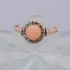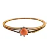A CORAL AND DIAMOND GOLD HINGED BANGLE — Mounted with a central coral bead with a surround of rose cut diamonds, on a hinged bangle on yellow metal that tests as 18ct gold, the inside measuring 21.8mm…