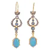 A Victorian turquoise and seed pearl set 15ct gold brooch, marquise shaped form overlaid with applied scroll work, cabochon turquoise and pearl floral accents, beaded border, length approx 43mm, C cla…