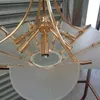 RALPH LAUREN: THREE GILT-METAL AND OPALINE GLASS MOUNTED PLAFFONNIERS OR CEILING LIGHTS (3) — Modern With ribbed moulded glass sides, each enclosing three lights, one dish light missing opaline glass …