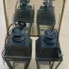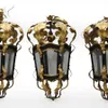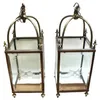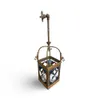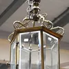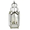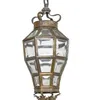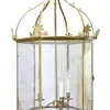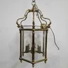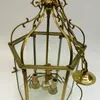 Mid to late 20th C brass ceiling hanging three candle lantern light with six glazed panels.