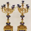A PAIR OF FRENCH SEVRES-STYLE PORCELAIN AND GILT BRONZE FIVE LIGHT CANDELABRAS each with cobalt blue porcelain sections finely painted with floral garlands and gilt ornamentation, mounted in richly ca…