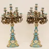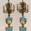 A PAIR OF FRENCH SEVRES-STYLE PORCELAIN AND GILT METAL FIVE LIGHT CANDELABRA each features a turquoise blue porcelain urn painted with romantic courting scenes to the front and pastoral landscapes to …