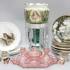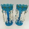 A pair of late Victorian blue glass lustres decorated with a band of flowers and gilt. All droplets present. (Some wear to gilding, minimal chips).