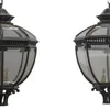 A pair of early to mid 19th Century etched glass and brass cased lanterns, brass finials and hanging hooks to top. (2)