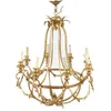 A GRADUATED SET OF THREE GILT METAL CHANDELIERS (3) — 20th Century Each comprising a central rope twist band surrounded by scrolling leaf-capped supports each terminating in a light, connected by swag…