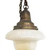 A 20th century single holophane pendant light with metal fittings and of traditional Art Deco style design, suspended on linked metal chain.