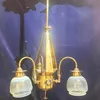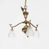 An Art Nouveau brass three branch chandelier with glass shades, approximate height 70cm.
