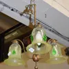 A Brass Arts and Crafts ceiling hanging light with yellow Vaseline shades with 3 Ruskin style cabochons 68 cm full length drop Condition: Good used, movement to arms Please note:- untested View all