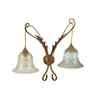 A pair of Rise and Fall Arts and Crafts style brass light fittings with ice blue Vaseline shades, supported on scroll arms. height adjustable. measures 52 cm across the arm Condition: Good used Please…