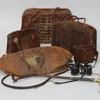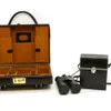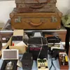 Vintage luggage. Including a crocodile holdall, 57cm wide, a crocodile handbag, a snakeskin bag, 40cm wide and a leather holdall. Together with a silver mounted riding crop and a pair of Zeiss field g…