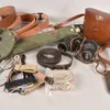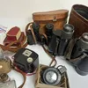 A collection of vintage early to mid 20th century binoculars and cameras including video camera.
