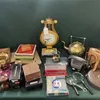 Selection of household and other collectible items to include boxed vintage Parker pens, Taron 35mm camera and case & assorted binoculars + An Hour Lavigne French quartz lyre clock in early 19th centu…