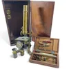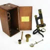 An early 20th Century antique brass microscope with accessories.