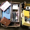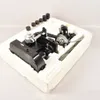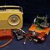 A modern vintage radio, a mid 20th Century child's sewing machine, vintage cameras, miners lamp with binoculars.