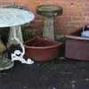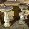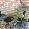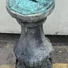 A cast iron ornate bird bath along with a cast iron sun dial.