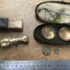 George III tin cased pocket scales with weights, c1772, George III pocket date dial along with a George II child's brass alphabet plaque, c1729.
