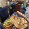 A collection of brassware including pans, balance scales etc