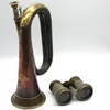 A Hawkes & Son of London copper and brass bugle (with few dents and wear), along with a pair of The Jockey Club opera glasses (leather worn, few dents to metal). (2)
