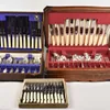 FOUR SETS OF FLATWARE (4) — Comprising; twelve pairs of dessert or fruit knives and forks, having mother-of-pearl handles, with an oak case and three set of six tea knives, having loaded silver handle…