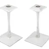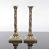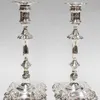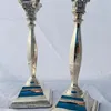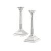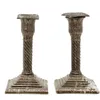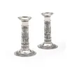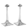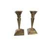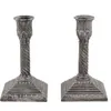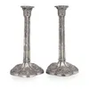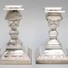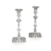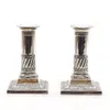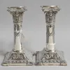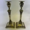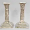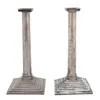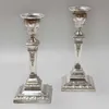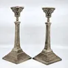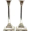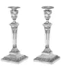 A pair of sterling silver square based candlesticks. Measuring approximately 26cm in height and with removable inserts. Engraved with Hebrew script. Marked for D J Silver Repairs, Clerkenwell Roa